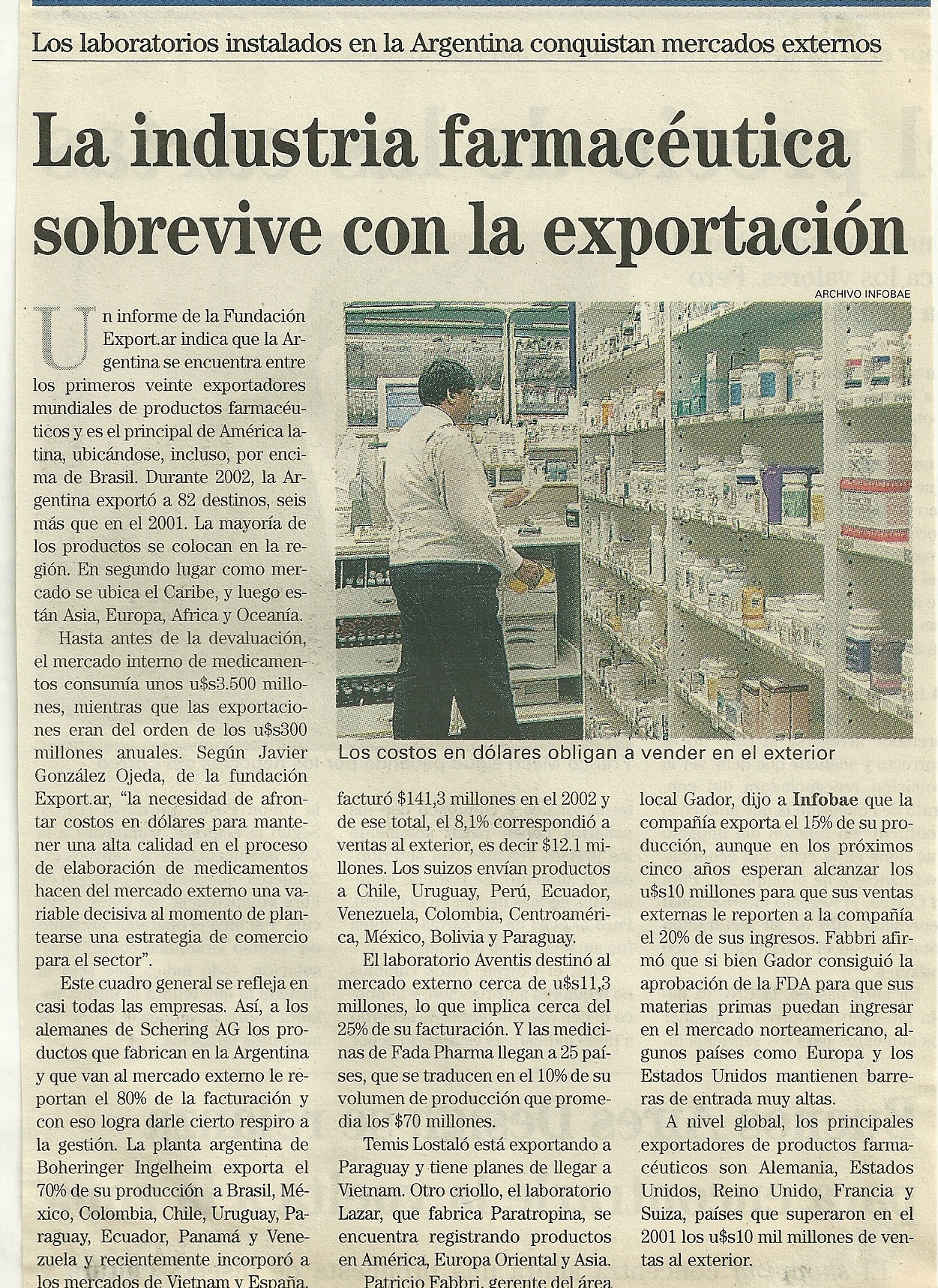 Un informe de la Fundación Export.ar indica que la Argentina se encuentra entre los primeros veinte exportadores mundiales de productos farmacéuticos y es el principal de América Latina, ubicándose, incluso, por encima de Brasil. Durante 2002, la Argentina exportó a 82 destinos, seis más que en el 2001. La mayoría de los productos se colocan en la región. En segundo lugar como mercado se ubica el Caribe, y luego están Asia, Europa, África y Oceanía.