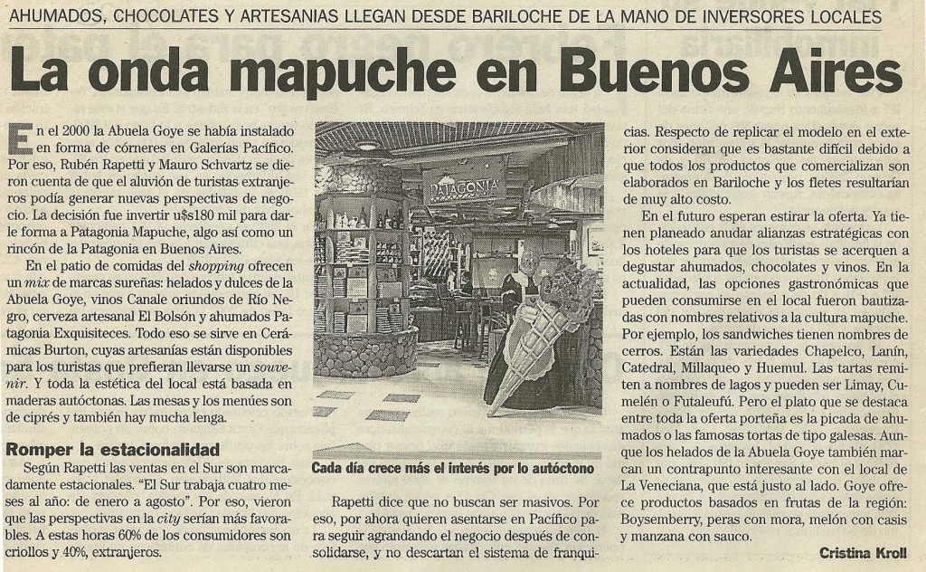 En el 2000 la Abuela Goye se había instalado -en forma de córneres en Galerías Pacífico. Por eso, Rubén Rapetti y Mauro Schvartz se dieron cuenta de que el aluvión de turistas extranjeros podía generar nuevas perspectivas de negocio. La decisión fue invertir u$s180 mil para darle forma a Patagonia Mapuche, algo así como un rincón de la Patagonia en Buenos Aires.