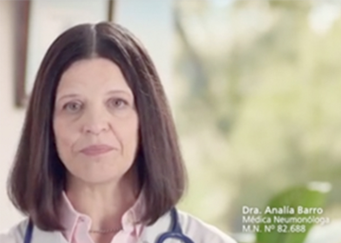 En el corto publicitario, la médica neumonóloga Analía Barro es la profesional a cargo de las explicaciones científicas que respaldan la veracidad de lo dicho, tal como lo exigen las autoridades regulatorias argentinas.
