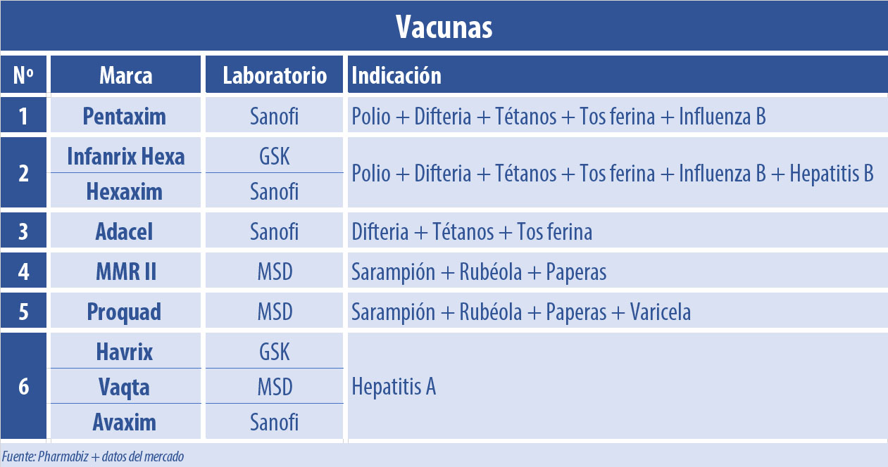 A su vez, Sanofi comercializa su vacuna quíntuple Pentaxim -contra polio, difteria, tétanos, tos ferina e influenza b-; y Hexaxim, que suma la inmunización contra hepatitis B, y que le da batalla a Infanrix Hexa, de GSK. Mientras tanto, MSD alza bandera además con MMR II, su vacuna para sarampión, rubéola y paperas; y con Proquad que agrega la inmunización contra la varicela.
