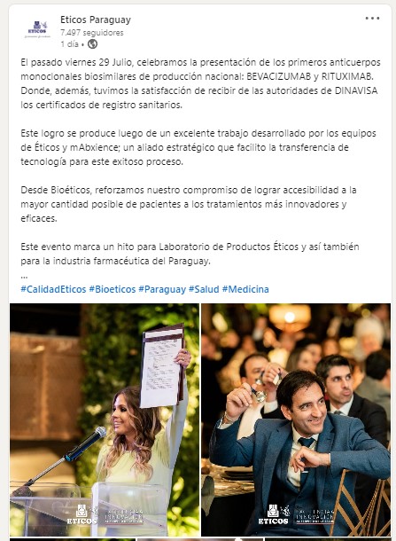 El laboratorio paraguayo Éticos consolida su estrategia en el negocio de los biosimilares. Apoyándose en el expertise de mAbxience, se avanzó con un proceso de transferencia de tecnología. Ver Linkedin