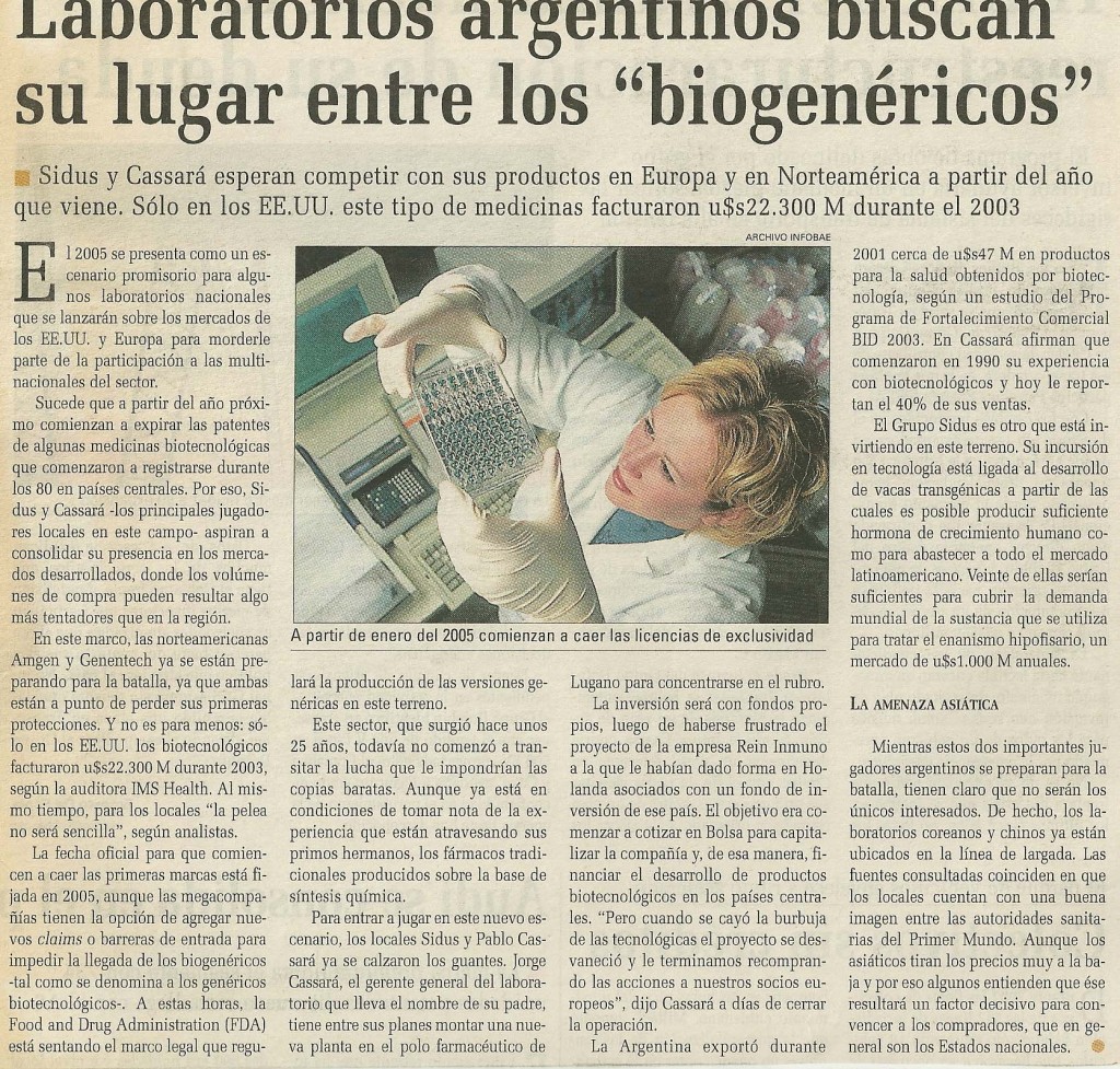 Sucede que a partir del año próximo comienzan a expirar las patentes de algunas medicinas biotecnológicas que comenzaron a registrarse durante los 80 en países centrales. Por eso, Sidus y Cassará -los principales jugadores locales en este campo- aspiran a consolidar su presencia en los mercados desarrollados, donde los volúmenes de compra pueden resultar algo más tentadores que en la región.
