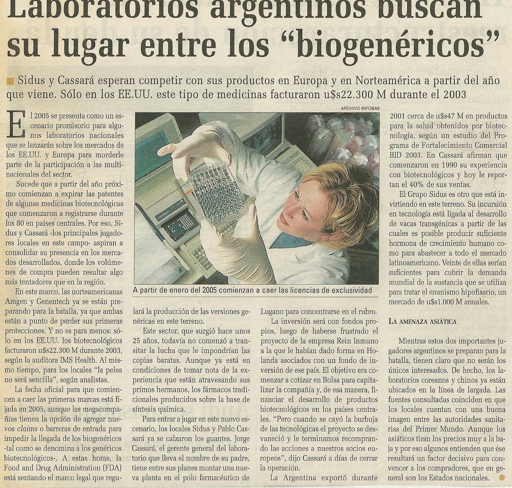La Argentina exportó durante 2001 cerca de u$s47 M en productos para la salud obtenidos por biotecnología, según un estudio del Programa de Fortalecimiento Comercial BID 2003. En Cassará afirman que comenzaron en 1990 su experiencia con biotecnológicos y hoy le reportan el 40% de sus ventas.
