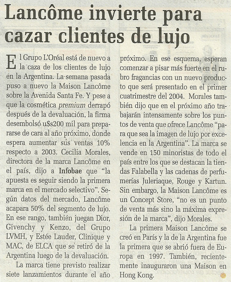 En el año 2003 -y luego de la devaluación de la moneda local- maison Lancôme había recibido una inyección de u$s 200 mil para volver a apostar al lujo en el país. Ver artículo. Durante ese año, la compañía, había puesto a nuevo su maison para retomar la iniciativa.
