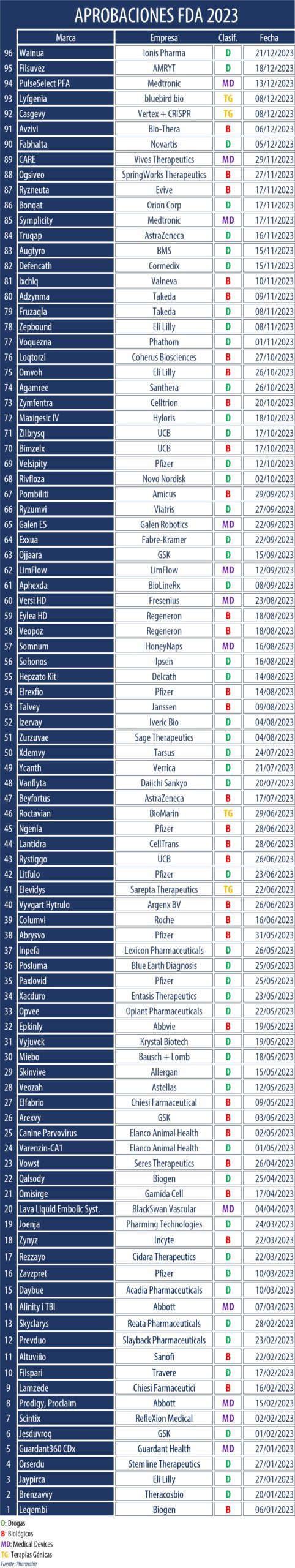 Las aprobaciones de la FDA siempre se constituyeron como un faro para el resto de sus organismos pares, los que toman como referencia todas sus decisiones respecto de la aprobación de nuevos productos. En ese contexto, resulta relevante pasar revista a cada una de las aprobaciones del organismo durante el 2023, las que fueron compiladas hoy en un informe especial. Ver Documento
