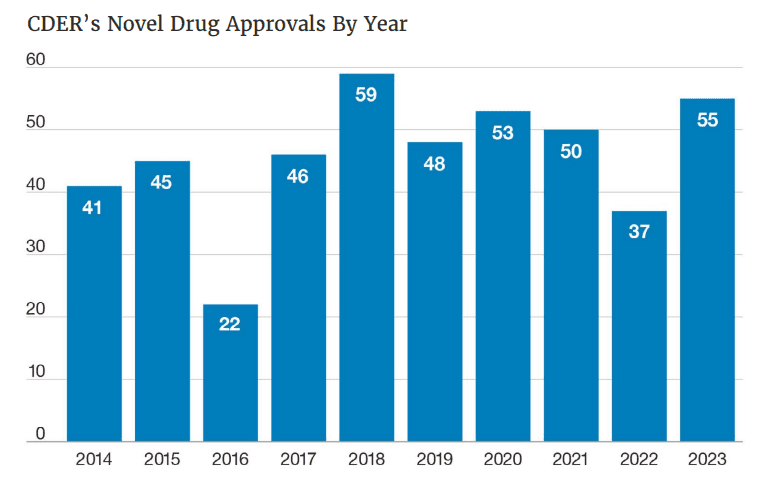 De acuerdo con el documento, la FDA fue super prolífica durante el 2023. La agencia le dio el visto bueno a 55 moléculas nóveles durante el año pasado. Así generó un 48.6% más de avales respecto del 2022, cuando surgieron 37 productos aprobados. Es así que la agencia regulatoria recuperó e incluso superó el ritmo que llevaba en el 2021 y el 2020, los dos años más críticos de la pandemia de COVID-19, en los que los avales fueron 50 y 53, respectivamente. Informe FDA del 2022