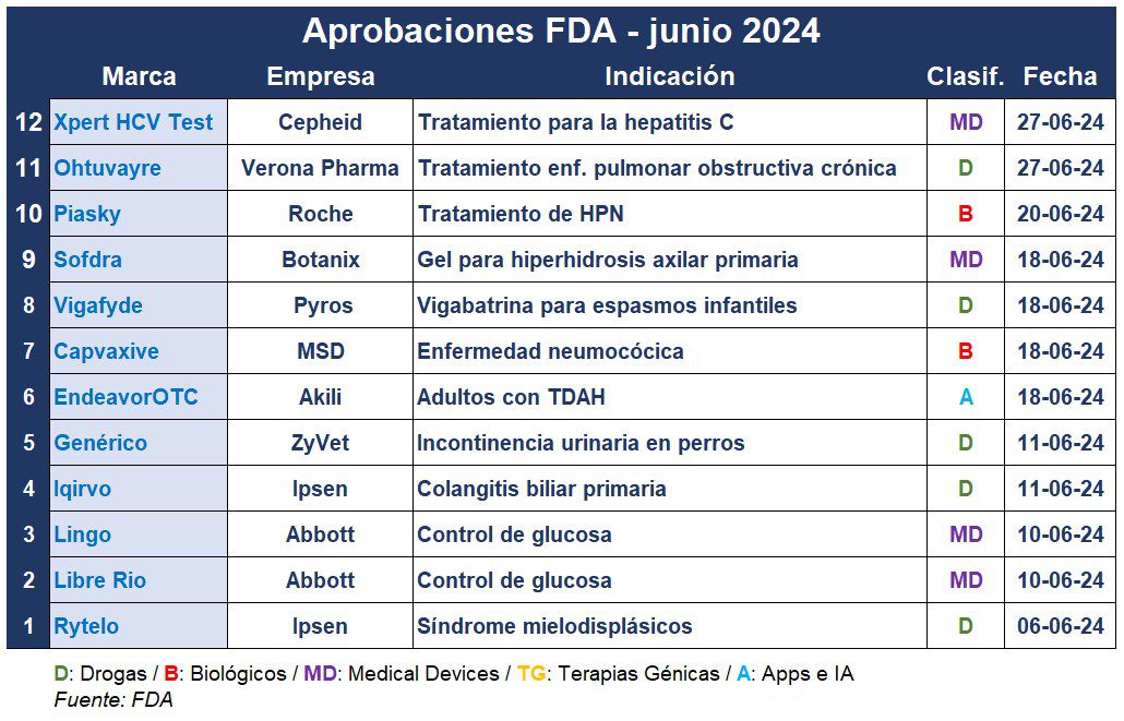 La FDA cerró junio con más de una docena de nuevas aprobaciones. La lista del mes incluye una vacuna conjugada 21-valente contra el neumococo, un tratamiento para un grupo de trastornos de la médula ósea, dos nuevos dispositivos de control de la glucosa, y la aprobación acelerada de una molécula para la colangitis biliar primaria. La biotech californiana Geron recibió el aval de la FDA para Rytelo, diseñado para tratar un grupo de trastornos de la médula ósea llamados síndromes mielodisplásicos (SMD). A base de imetelstat, el inhibidor de la telomerasa está indicado para adultos con SMD de riesgo bajo a intermedio y anemia dependiente de transfusiones que no han respondido, han perdido respuesta o no son elegibles para recibir agentes estimulantes de la eritropoyesis. La empresa fijó el costo de adquisición mayorista de un vial monodosis de 47 mg en u$s 2.471. Las dosis están determinadas por el peso corporal del paciente. Ver FDA aprueba Rytelo La agencia regulatoria aprobó dos nuevos dispositivos de control de la glucosa de la norteamericana Abbott, ambos de venta libre. Uno de estos, Libre Rio, está dirigido a personas con diabetes tipo 2 que no usan insulina y generalmente controlan su diabetes mediante modificaciones en el estilo de vida. El otro producto, Lingo, ayudará a realizar un seguimiento de la glucosa y proporcionará información personalizada en pos de mejorar el bienestar general de personas sin diabetes que están preocupadas por su salud. Ambos están basados en su tecnología FreeStyle Libre. Ver FDA aprueba Lingo y Libre Rio Los franceses Ipsen y Genfit consiguieron una aprobación acelerada para Iqirvo. El producto está indicado para la colangitis biliar primaria o CBP, y funciona activando ciertos receptores, que reducen la inflamación, aumenta el transporte de ácidos biliares fuera del hígado y promueve su desintoxicación. Su precio está estimado en u$s 11.500 por un suministro mensual, y competirá con Ocaliva de Intercept Pharmaceuticals. Ver FDA aprueba Iqirvo La FDA también anunció que amplió el rango etario recomendado para utilizar Arexvy, la primera vacuna contra el virus sincicial respiratorio (VSR) avalada en el mundo, desarrollada por la británica GSK. Aprobada en mayo del 2023 para adultos mayores de 60 años, ahora personas a partir de los 50 también podrán utilizarla. Esta actualización llega un mes después de que la estadounidense Moderna logre la aprobación de su propia vacuna contra el VSR: mRESVIA. Ver FDA aprueba Arexvy 2023 | Ver actualización FDA La FDA aprobó Capvaxive, de la estadounidense MSD. Esta es una vacuna conjugada 21-valente para proteger contra el neumococo en pacientes adultos. Hay alrededor de 100 cepas de bacterias que pueden causar la enfermedad. En un ensayo, la vacuna de MSD ayudó a producir una respuesta inmune contra 21 serotipos de la bacteria. En el mercado competirá con Prevnar 20 de Pfizer. Ver FDA aprueba Capvaxive La norteamericana Pyros Pharmaceuticals recibió la aprobación de la FDA para Vigafyde, una monoterapia para pacientes pediátricos de entre un mes y dos años de edad con espasmos infantiles (EI). Esta es la primera solución oral de vigabatrina en recibir aprobación, y está indicada siempre y cuando los beneficios potenciales justifiquen el riesgo de pérdida de visión. Según la empresa, estará disponible en los Estados Unidos en la segunda mitad de 2024. Ver FDA aprueba Vigafyde La agencia regulatoria le dio luz verde a un videojuego como la primera terapia digital de venta libre para adultos con trastorno por déficit de atención e hiperactividad. Se trata de EndeavorOTC de la empresa de terapias digitales Akili, que obtiene así su segunda autorización. La compañía advirtió que el juego debe usarse como parte de un programa terapéutico, el que también podría incluir terapia dirigida por un médico, medicación y/o programas educativos. Ver FDA aprueba EndeavorOTC Por el ala veterinaria, ZyVet Animal Health obtuvo el visto bueno para los primeros comprimidos masticables genéricos de clorhidrato de fenilpropanolamina para el control de la incontinencia urinaria debido al hipotonía del esfínter uretral en perros. El producto contiene el mismo ingrediente activo en la misma concentración y forma de dosificación que las tabletas masticables Proin de PRN Pharmacal. Ver FDA aprueba genéricos Proin La especialista estadounidense en dermatología Botanix Pharmaceuticals consiguió la aprobación de la FDA para Sofdra. Este gel tópico a base de sofpironium se convierte en el primer producto químico para el tratamiento de la hiperhidrosis axilar primaria (sudoración excesiva de las axilas), y está indicado para mayores de 9 años. La compañía planea lanzar un programa de experiencia temprana en el tercer trimestre del año 2024. Ver Press Release La suiza Roche recibió luz verde para Piasky, su tratamiento de la hemoglobinuria paroxística nocturna (HPN), en personas mayores de 13 años. La HPN es una afección sanguínea rara y potencialmente mortal en la que parte del sistema inmune del cuerpo destruye los glóbulos rojos. Puede provocar síntomas como anemia, fatiga y coágulos de sangre. Piasky contiene crovalimab-akkz, un inhibidor de C5 que se recicla en el torrente sanguíneo. Se administra como una dosis de carga única mediante infusión intravenosa, seguida de cuatro dosis de carga semanales. Ohtuvayre se convirtió en la primera terapia aprobada para el laboratorio británico Verona Pharma. A base de ensifentrine, el producto inhalado recibió el aval de la FDA para tratar la enfermedad pulmonar obstructiva crónica (EPOC). La terapia relaja los músculos alrededor de las vías respiratorias, facilitando la respiración y reduciendo la inflamación en los pulmones sin usar esteroides. Ver FDA aprueba Ohtuvayre Cepheid, una empresa estadounidense que se especializa en diagnósticos, consiguió el OK de la FDA para su prueba Xpert HCV Test y 
