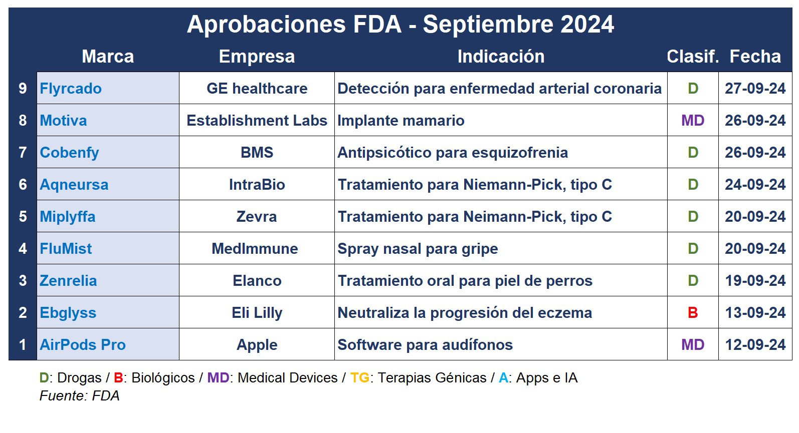 Y casi al cierre del mes la FDA aprobó la primera terapia para la esquizofrenia en décadas. Cobenfy de la estadounidense BMS es el primer producto antipsicótico aprobado para tratar la esquizofrenia que se dirige a los receptores colinérgicos en lugar de a los receptores de la dopamina. Ver FDA aprueba Cobenfy de BMS
