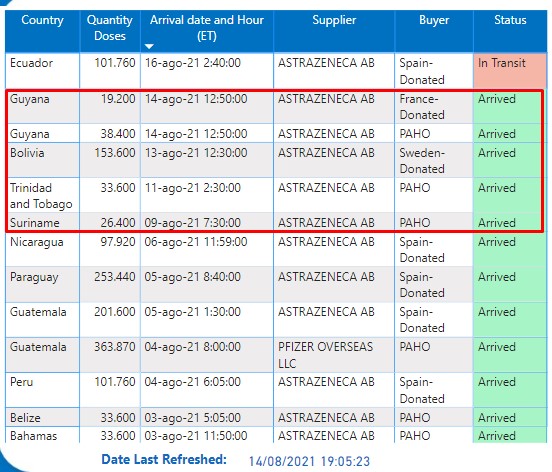 Surinam recibió 26.400 dosis el lunes 09 de agosto. Dos días después, llegaron a Trinidad y Tobago 33.600 unidades. Todas tuvieron origen en la Organización Panamericana de la Salud (OPS).