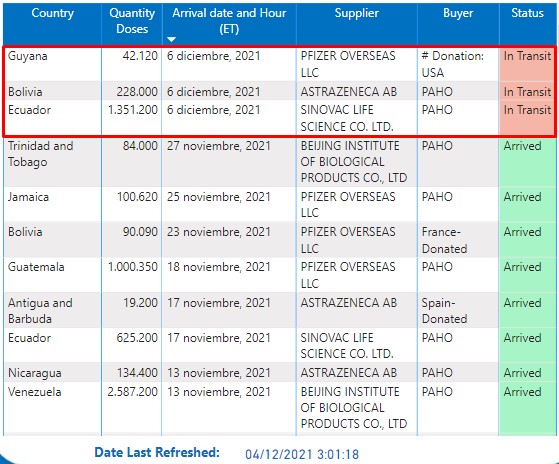 De acuerdo con el sitio de la PAHO, el programa retomará su actividad mañana 6 de diciembre. Según se informó, en el arranque de la semana llegarán dosis a Ecuador, Bolivia y Guyana. Será una triple entrega que al momento se encuentra «en tránsito».