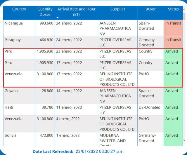 Ell lunes 17 de enero fue un día clave. Arribaron a Venezuela 3.1 millones de unidades de la china CanSino, y gestionadas a través de la Organización Panamericana de la Salud. Luego Perú recibió 1.9 millones de dosis que le compró a la norteamericana Pfizer y otro cargamento de idénticas características fue recepcionado hoy domingo 23.
