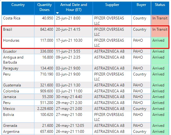 Los arribos de vacunas del mecanismo COVAX fueron acotados esta semana. Solo llegó una partida de 117.000 unidades de Pfizer a Honduras. Sin embargo, para los próximos 7 días se espera la llegada de 883.350 dosis a Brasil y Costa Rica, que provendrán también del laboratorio estadounidense.