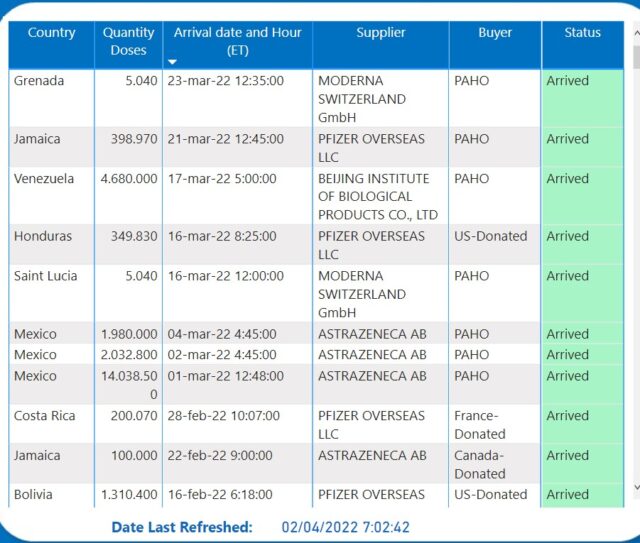Los últimos envíos fueron realizados los días 21 y 23 de marzo, ambos dispuestos por la Organización Panamericana de la Salud (OPS), con destino a Jamaica y Grenada. Las dos partidas estuvieron conformadas por una cantidad ínfima de unidades: 389.970 y 5.040 dosis, respectivamente. Las mismas pertenecían a la norteamericana Pfizer y a la estadounidense Moderna.