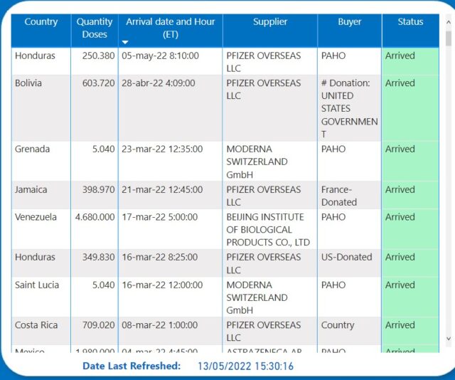 El último vuelo fue realizado el jueves 5 de mayo. El mismo llegó a Honduras y contó con 250.380 dosis de la vacuna Comirnaty, de la norteamericana Pfizer.