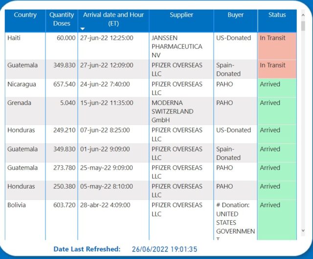 El cargamento que ya fue despachado, arribó el día viernes 24 a Nicaragua. El mismo estuvo conformado por 657.540 unidades de Comirnaty, una vacuna de la norteamericana Pfizer y la alemana BioNTech. Todo fue dispuesto por la OPS. Ver PAHO.