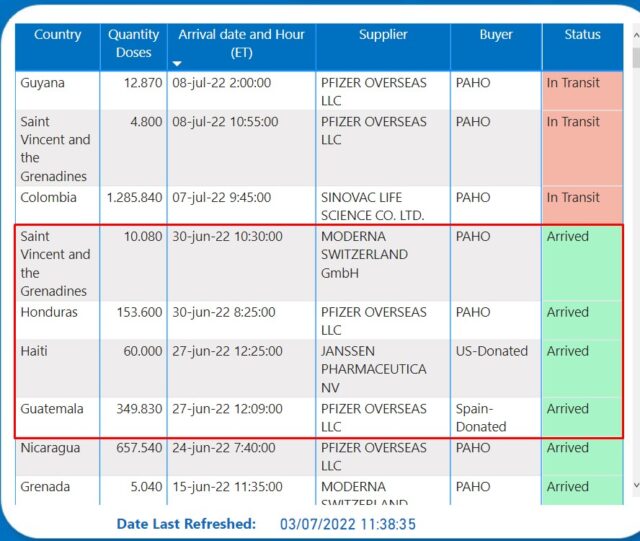 Del total de lotes enviados, dos arribaron el lunes 27 de junio. El primero desembarcó en Guatemala, conformado por 350 mil dosis de Comirnaty, elaborada por la norteamericana Pfizer y la alemana BioNTech. El mismo fue vía donación del estado español. El segundo corrió por cuenta de Estados Unidos y llegó a Haití, integrado por 60 mil unidades de la norteamericana Janssen.