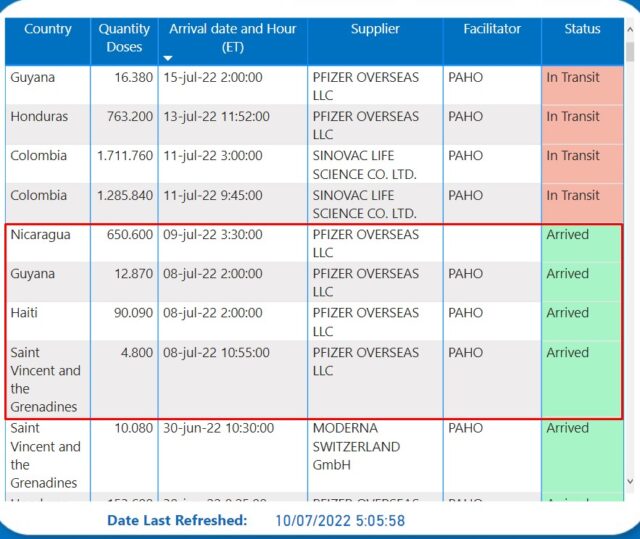 Del total de partidas despachadas, tres tuvieron fecha de recepción el viernes 8. Una de ellas, integrada por 4.800 unidades, llegó a San Vicente y las Granadinas; la segunda, compuesta por 91 mil dosis, tocó suelo en Haití; y, por último, ese día también arribaron, en Guayana, otras 12 mil unidades.