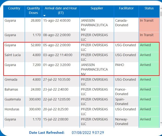 Y otros dos lotes llegaron a Guyana. Uno de ellos se despachó el lunes 1, dispuesto por la OPS y conformado por 7 mil unidades de la norteamericana Janssen; en tanto, el segundo fue enviado el viernes 5, con un total de 53 mil dosis de Comirnaty, también donadas por los Estados Unidos.