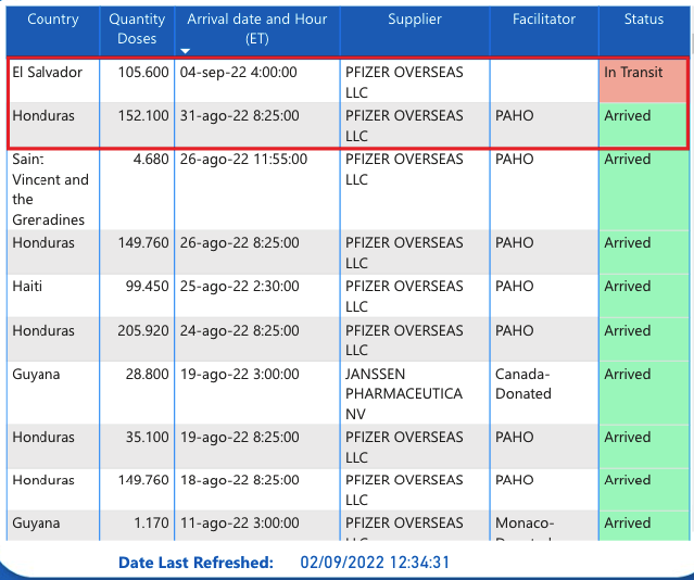 Uno de los lotes fue dispuesto por la OPS y arribó el miércoles 31 a Honduras. El mismo estuvo compuesto por 152.1 mil dosis. El segundo, por su parte, va camino a El Salvador con un total de 105.6 mil unidades, y estaba pautado llegue hoy, domingo 4. En tanto, aún no se encuentran programados próximos envíos para el mes de septiembre.