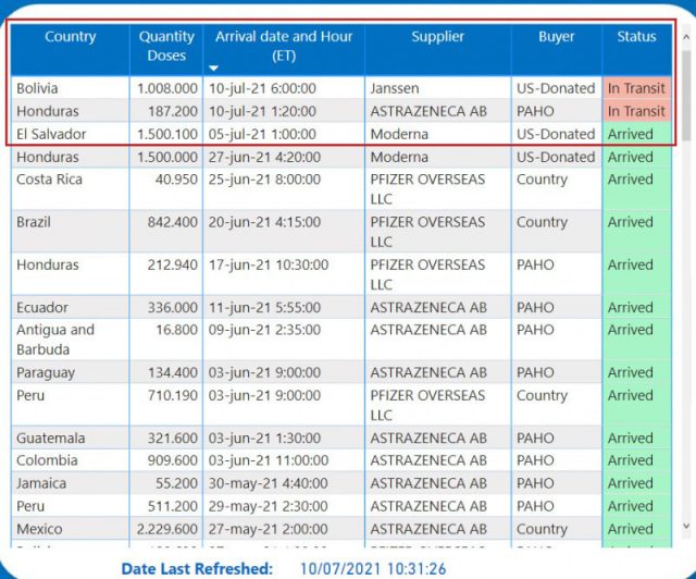 Mientras tanto, hay dos envíos en tránsito, y ambos estiman arribar durante hoy, sábado 10 de julio. Por un lado, Bolivia recibirá más de 1 millón de unidades de Janssen, también mediante una donación de los Estados Unidos. Ver PAHO.