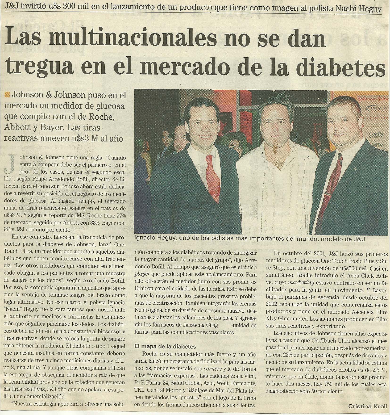 En ese contexto, LifeScan, la franquicia de productos para la diabetes de Johnson, lanzó OneTouch Ultra, un medidor que apunta a aquellos diabéticos que deben monitorearse con alta frecuencia. «Los otros medidores que compiten en el mercado obligan a los pacientes a tomar una muestra de sangre de los dedos», según Arredondo Bofill. Por eso, la compañía apuntará a aquellos que aprecien la ventaja de tomarse sangre del brazo como lugar alterativo. En ese marco, el polista Ignacio «Nachi» Heguy fue la cara famosa que mostró ante el auditorio de médicos y minoristas la complicación que significa pincharse los dedos. Los diabéticos deben acudir en forma constante al biosensor y tiras reactivas, donde se coloca la gotita de sangre para obtener la medición. El diabético tipo 1 -aquel que necesita insulina en forma constante debería realizarse de tres a cinco mediciones diarias y el tipo 2, una al día. Y aunque otras compañías utilizan la estrategia de obsequiar el medidor a raíz de que la rentabilidad proviene de la rotación que generan las tiras reactivas, J&J dijo que no apelará a esa política de comercialización.