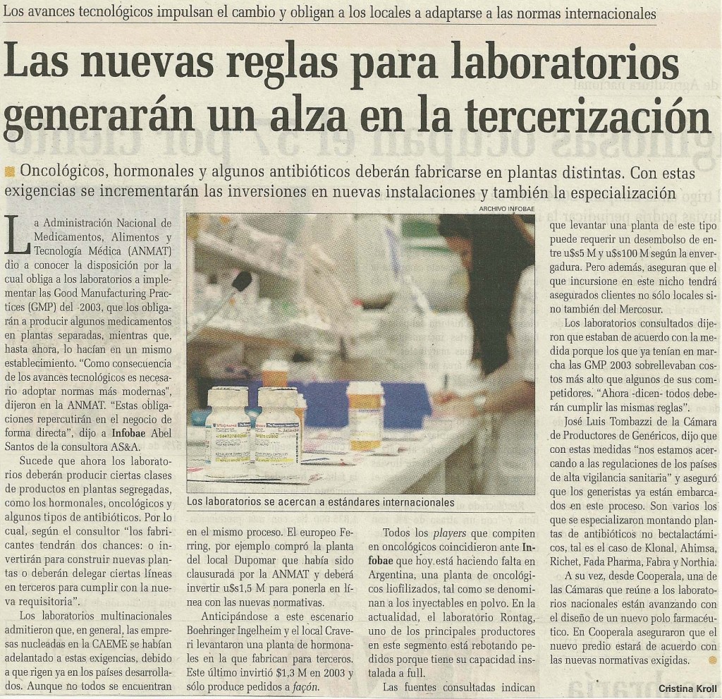 La Administración Nacional de Medicamentos, Alimentos y Tecnología Médica (ANMAT) dio a conocer la disposición por la cual obliga a los laboratorios a implementar las Good Manufacturing Practices (GMP) del -2003, que los obligarán a producir algunos medicamentos en plantas separadas, mientras que, hasta ahora, lo hacían en un mismo establecimiento. «Como consecuencia de los avances tecnológicos es necesario adoptar normas más modernas«, dijeron en la ANMAT: «Estas obligaciones repercutirán en el negocio de forma directa«, dijo a Infobae Abel Santos de la consultora AS&A.