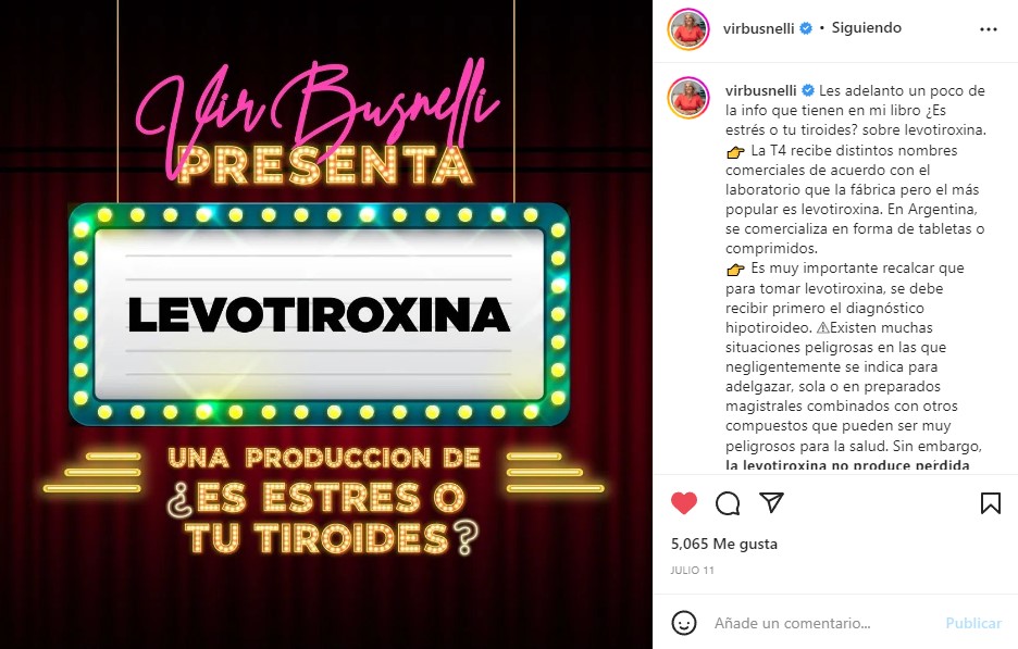 Y en sintonía con esta realidad, surgió la «influencer de la levo». Se trata de la endocrinóloga y nutricionista Virgina Busnelli que recientemente lanzó al mercado editorial su libro «¿Es estrés o tu tiroides?». Ver perfil.