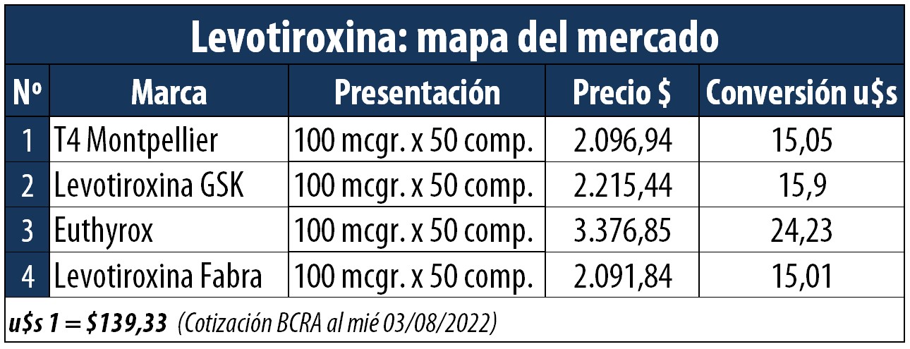 Y esto es porque una levotiroxina indicada como reemplazo hormonal para tratar hipotiroidismos de distintas causas, es el producto que más se vende en el mercado local. Se trata de la bautizada T4 Montpellier, que alcanza el primer lugar en el mercado de medicamentos de prescripción con una facturación total de $6.380 millones (u$s 56.6 millones)* en el primer semestre del año del 2022.