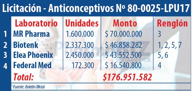 El Ministerio de Salud adjudicó hoy una licitación pública para la adquisición de anticonceptivos. Los ganadores son fundamentalmente compañías de genéricos. Por caso, Biotenk; el tercerista MR Pharma; y Federal Med que participa en nombre de Pfizer.