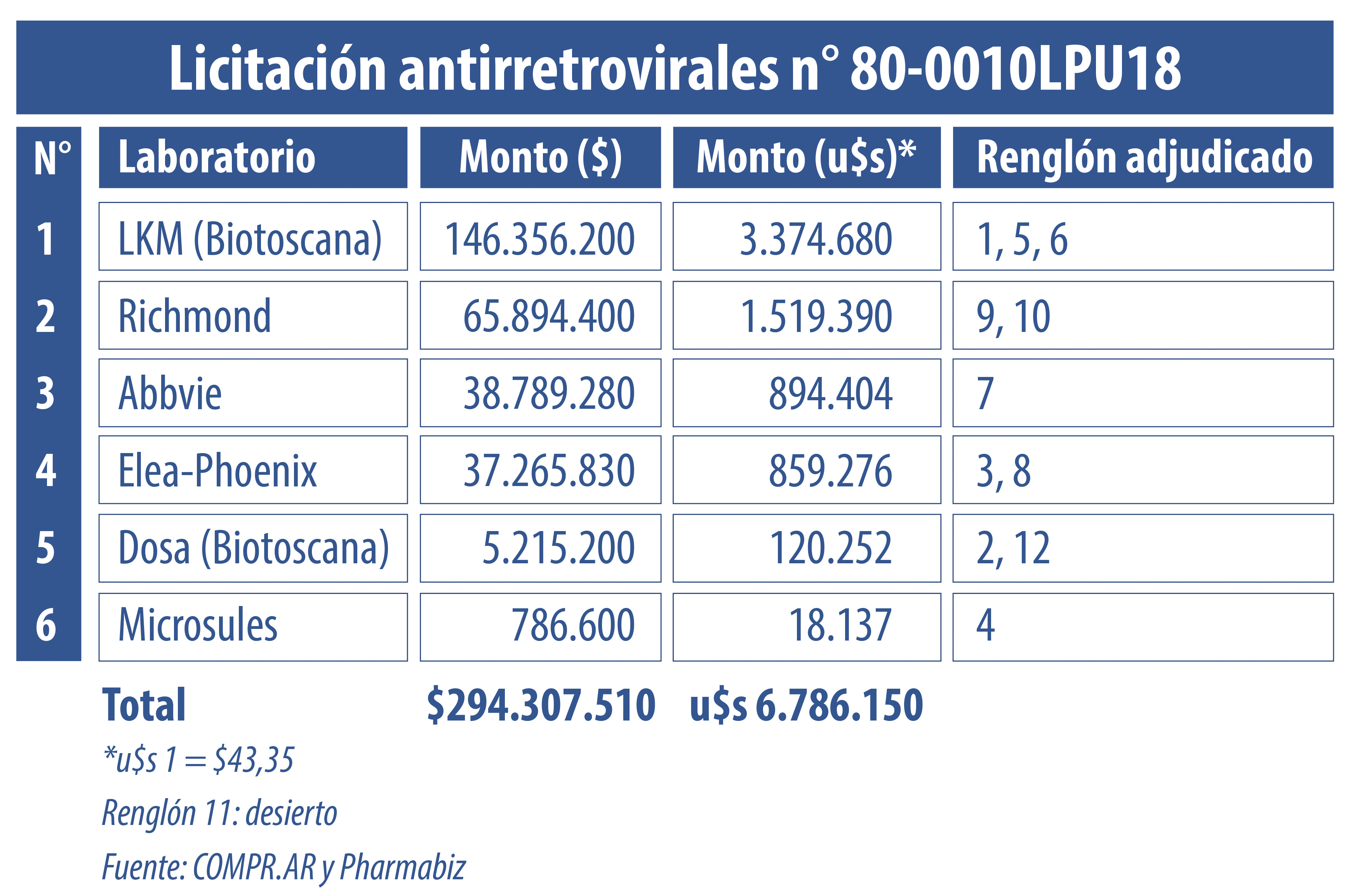 La licitación está conformada por una canasta de diferentes drogas. Sobresalen por caso ritonavir y también abacavir y tenofovir, cada una en diferentes fórmulas combinadas. El mayor volumen fue para ritonavir, renglón en el que resultó ganador la norteamericana Abbvie.