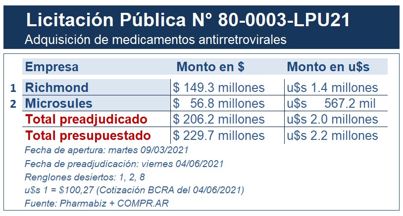 De acuerdo al desglose realizado por el equipo de analistas de Pharmabiz, el principal preadjudicatario es el laboratorio Richmond. La empresa fue recomendada para cubrir tres renglones con sus marcas Protease; Previd; y Zetrotax. De resultar finalmente elegida, la compañía podría facturar una suma de $149.3 millones (u$s 1.4 millones). La firma -que esta semana se presentó mediante su presidente Marcelo Figueiras en la Cámara de Diputados para discurrir sobre la elaboración local la vacuna Sputnik V- fue la única oferente para los renglones correspondientes a nevirapina 200 mg. -Protease-; y a zidovudina 10 mg. -Zetrotax-. Ver artículo Figueiras y Vaquer al Congreso, informe