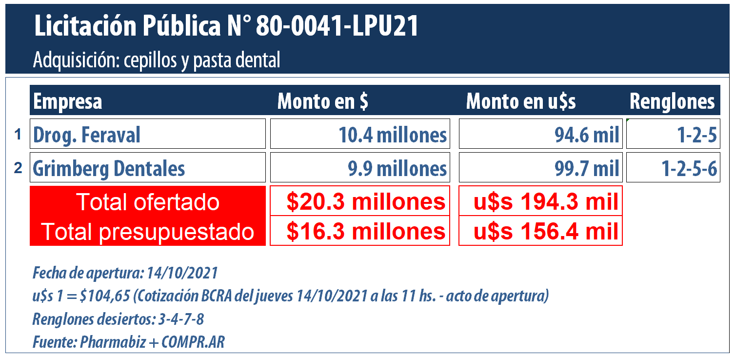 Según el desglose realizado por el equipo de analistas de Pharmabiz, para esta compra -que fue solicitada por la Dirección de Salud Bucodental– se apuntaron dos empresas, las que levantaron la mano solo en los renglones correspondientes a cepillos. En tanto, nadie mostró interés en venderle pastas dentales al Estado. Se habían solicitado cuatro variedades, las que quedaron carentes de ofertas.