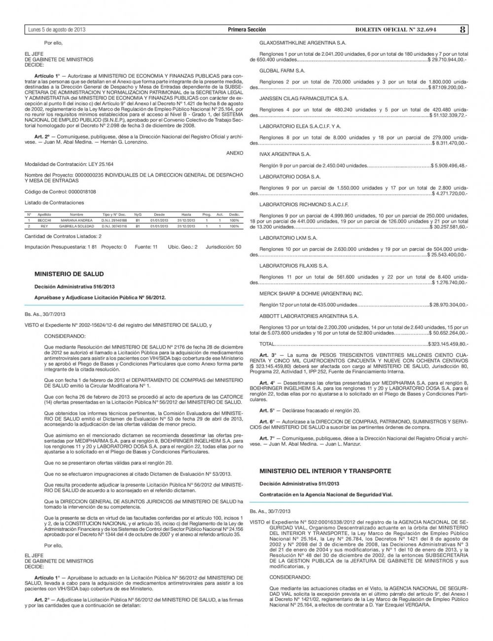 Se trata de diferentes partidas de medicamentos antirretrovirales destinados a pacientes con VIH/SIDA por los que el Estado desembolsará $323.1 millones (u$s 58.53 millones). Ver disposición.