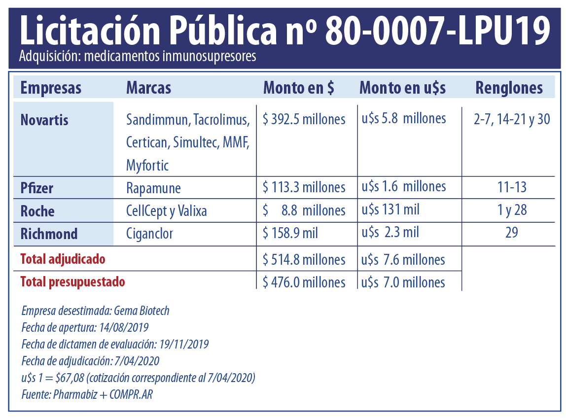 En este período de cuarentena y en la previa de los feriados de Semana Santa se dio por aprobada una licitación pública a fin de adquirir inmunosupresores por un total de $514.8 millones (u$s 7.6 millones). Las multis farmacéuticas fueron las grandes ganadoras.