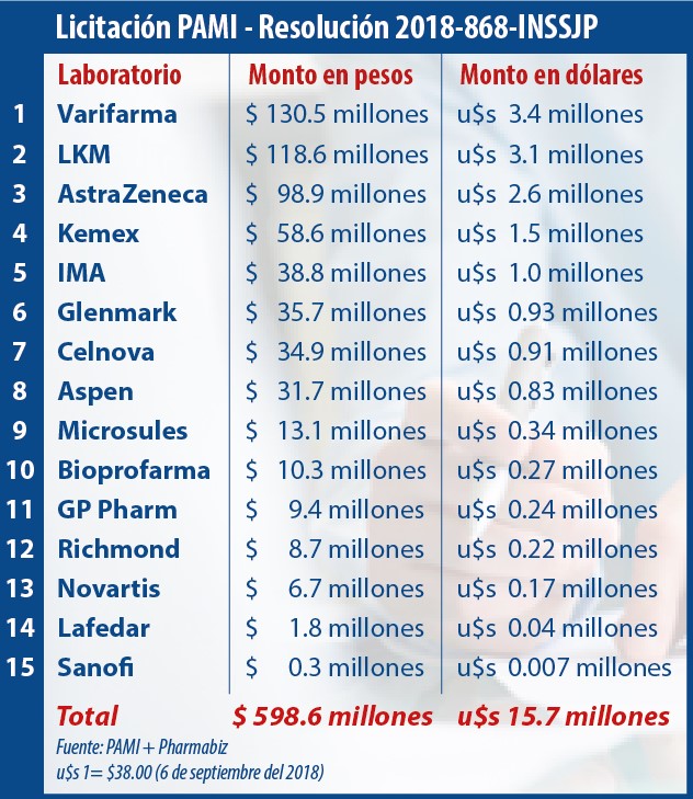 El gran ganador de la licitación fue el laboratorio nacional Varifarma. También figuran el grupo latino Biotoscana; el nacional Richmond; y la suiza Novartis, entre otras empresas. Antes también estaba incluida la británica AstraZeneca, aunque finalmente se terminó bajando.