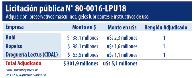 Se definieron los ganadores para una licitación pública de preservativos masculinos, geles lubricantes e instructivos de uso. Para la compra el Estado destinará una erogación de $301.9 millones (u$s 5.1 millones). Se trata de un monto marcadamente superior al estimado en marzo de este año.