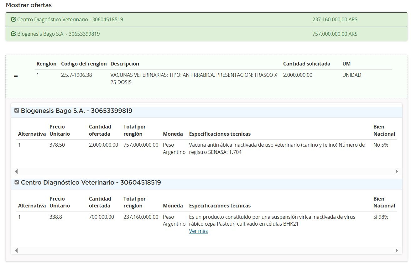 En tanto, los nacionales de Biogénesis Bagó, propiedad de los grupos Insud y Bagó, se anotaron por el total solicitado en el renglón único. Lo hizo con su marca Bagovac Rabia, y por un precio unitario de $379 (u$s 0.38), lo cual suma $757 M (u$s 757 mil). El producto es manufacturado en la planta que la firma tiene en Garín.