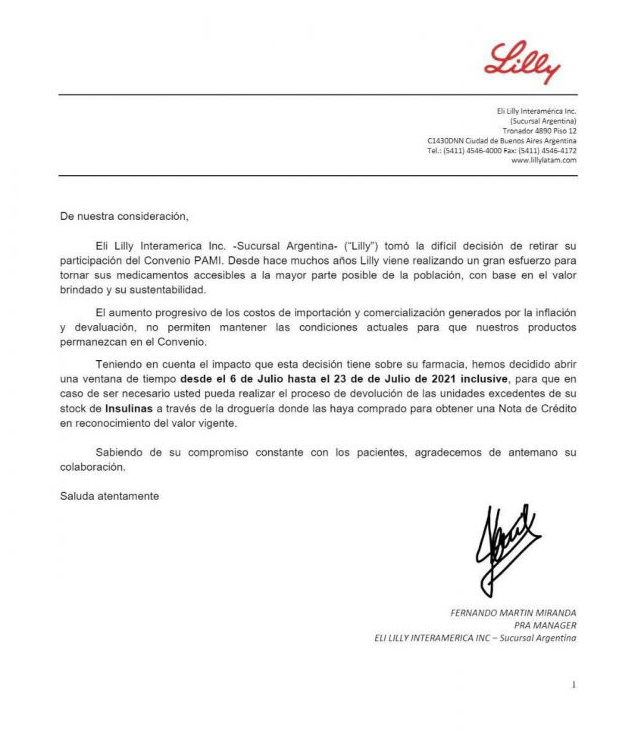 Según pudo saber Pharmabiz, la empresa ya oficializó la decisión mediante una carta que lleva la firma de Fernando Miranda, el Price, Reimbursement and Market Access manager de la filial local. En la misma se expresan los fundamentos de este paso. Se explica que «el aumento progresivo de los costos de importación y comercialización generados por la inflación y la devaluación, no permiten mantener las condiciones actuales para que nuestros productos permanezcan en el convenio«. Ver carta.