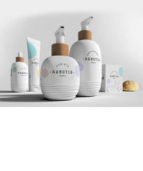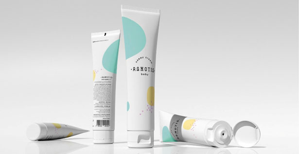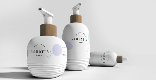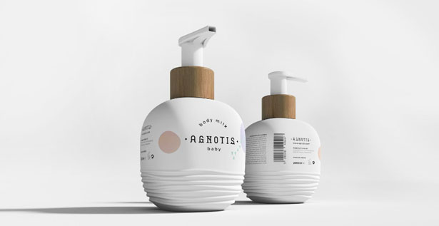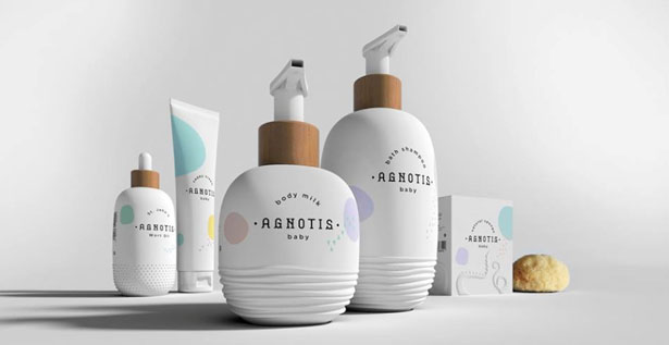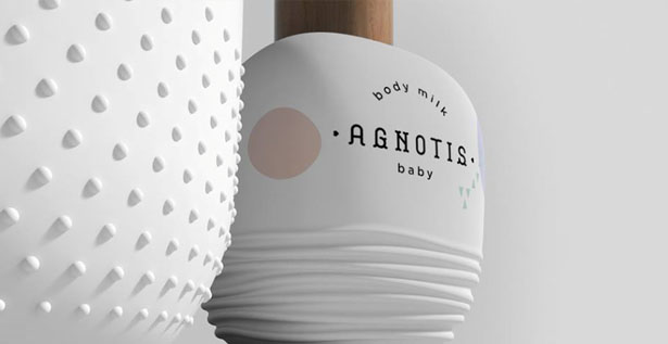 La marca Agnotis Βaby diseñó una línea para bebés cuyo packaging busca comunicar la esencia pura de los productos. Además los envases están inspirados en la formas de curvatura de los juguetes para recién nacidos.