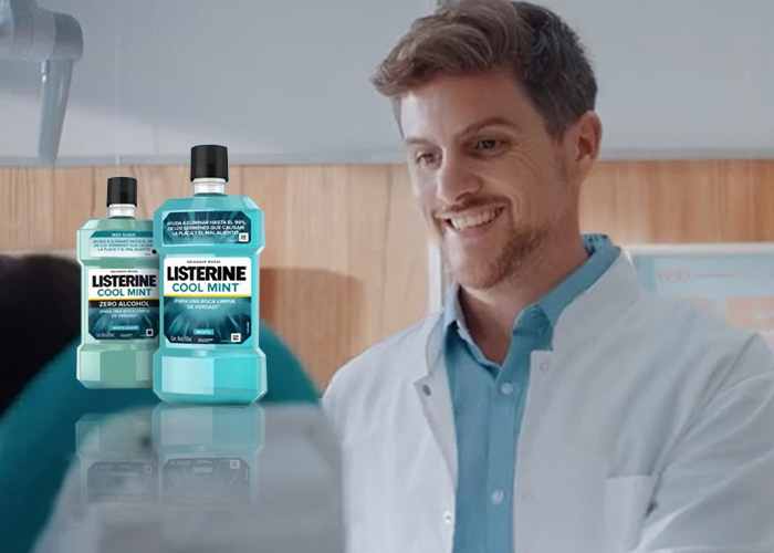 El spot tiene como principal protagonista al odontólogo Agustín Frau, quien dice a cámara que Listerine «es el enjuague n° 1 en el mundo«. El portafolio está conformado por 11 presentaciones, entre las que figuran las variedades Cool Mint, Freshburst, Cuidado Total, Control Sarro, Protección Dientes, Anticaries, y Whitening, entre otras.