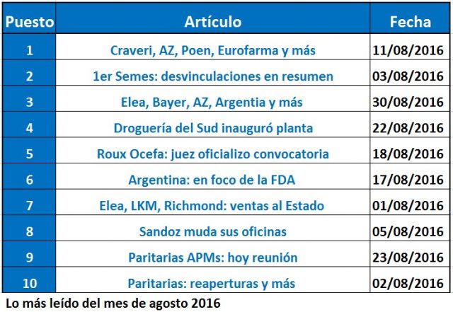 Mientras tanto, los temas regulatorios también llegaron al ranking de lo más leído de agosto en Pharmabiz. La FDA ocupó el sexto escalón con el artículo publicado a medidados de este mes. En el mismo se informó sobre el envío de duras advertencias a 14 fabricantes de dispositivos médicos, entre ellos la firma argentina F.P. Rubinstein y Cía, que comercializa la marca Starbene, enfocada en estética. Ver artículo