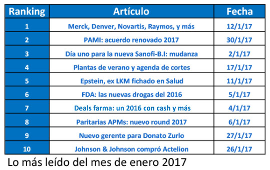 En el primer mes del año, Pharmabiz relevó los temas que más interesaron a los lectores del sitio. Los pases y nombramientos en las diferentes compañías fueron los que generaron más cantidad de clicks durante este período y se ubicaron en el primer lugar del top ten. Ver artículo.
