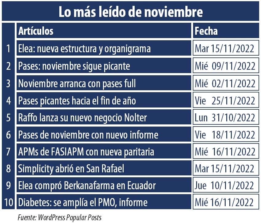 En noviembre, como es habitual, los pases de la industria de farma reinaron en el ranking de lo más leído del mes. Asimismo, las novedades de las firmas nacionales y las multis también llamaron la atención de la audiencia especializada.
