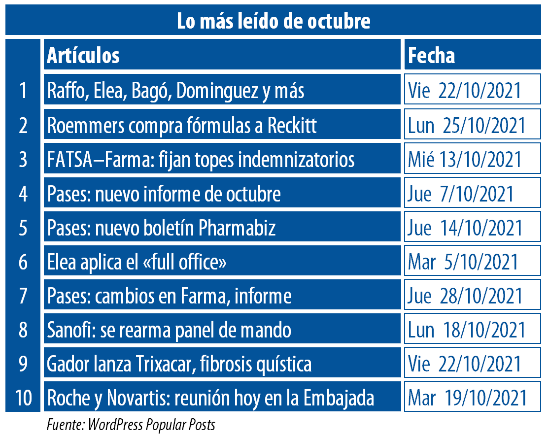 En el cuarto lugar del ranking se asentó un informe de pases, generado al jueves 7. Una vez más, los ingresos y egresos en el mercado laboral de farma se encuentran en el top 5 de este listado. El interés por este tipo de artículos continuó y al quinto escalón llegó otro boletín que detalló el movimiento de ejecutivos, en este caso el publicado el jueves 14 de octubre. Ver artículo Pases: nuevo informe de octubre / Ver artículo Pases: nuevo boletín Pharmabiz