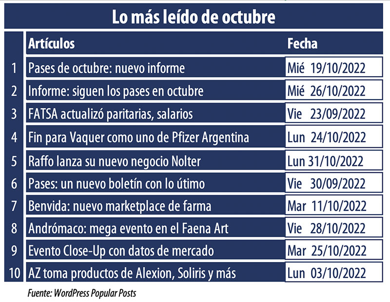 Los sueldos del sector son otro tema central para la audiencia especializada. Tal es así que la tercera nota más leída en octubre fue un informe que se envió a través del newsletter sobre la actualización de las paritarias. El artículo detalló un nuevo acuerdo entre la industria farmacéutica y FATSA, a fin de lograr una mejora salarial del 40%, en tres tramos, ante la escalada inflacionaria de la segunda mitad del año. Ver FATSA.
