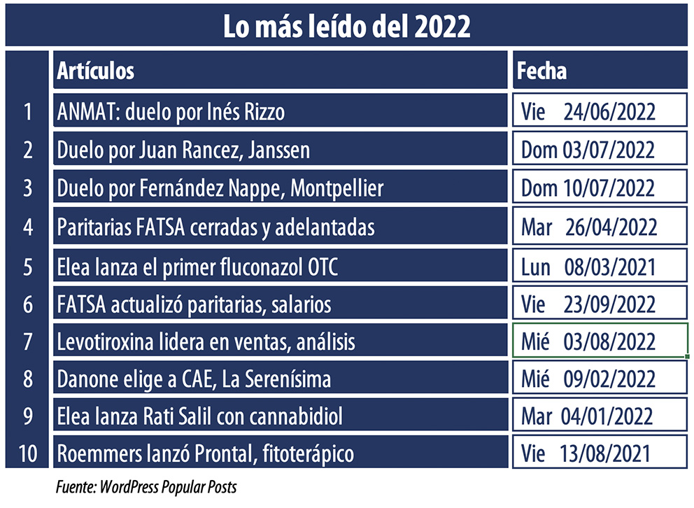 Por último, décimo llegó un artículo del 2021. Es que los interesados en obtener información de Prontal, un producto indicado para el tratamiento de la artrosis de cadera y rodilla, hicieron que esta nota figurara en el ranking de lo más leído del año. El antiartrósico, basado en extractos de insaponificables de palta y soja, fue lanzado el año pasado por el nacional Roemmers. Ver artículo Roemmers 2021.