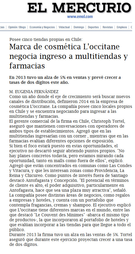 La empresa de cosméticos francesa L´Occitane, que cuenta con cinco locales propios en Chile, busca ahora ingresar a las multitiendas y farmacias de ese país.