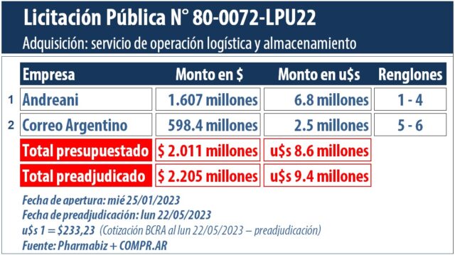 De acuerdo al desglose realizado por el equipo de analistas de Pharmabiz, son dos las empresas que resultaron recomendadas. La principal preadjudicataria, en términos de facturación, fue Andreani. El operador logístico, propiedad de la familia homónima y que tiene como CEO a Carlos Cirimello, podría percibir ingresos por $1.607 millones (u$s 6.8 millones) por la cobertura de los primeros cuatro renglones. Esto abarca el traslado y seguro de productos a temperatura controlada desde el Aeropuerto de Ezeiza y/o laboratorio ubicado en el AMBA o localizado entre 50 y 250 km del Ministerio de Salud de la Nación. También se lista la recepción, almacenamiento y preparación de pedidos en temperaturas controladas entre -25°C y -18°C, y entre -90°C y -60°C. Ver Cuadro Comparativo