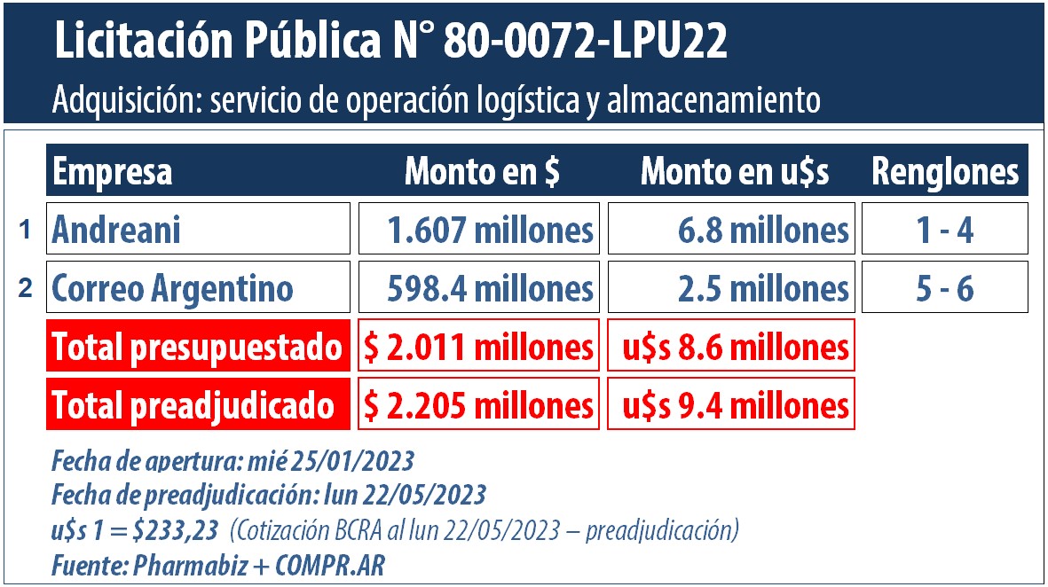 Asimismo, Correo Argentino resultó preadjudicada para la distribución y el seguro de transporte de los stocks en las 23 provincias del país y en CABA. La empresa pública prevé facturar $598.4 millones (u$s 2.5 millones). Ver Dictamen de Evaluación.