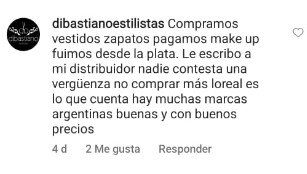 Dibastiano Estilistas said «we bought clothes, shoes, make-up, we travelled from La Plata. I’ve written to my distributor and nobody answers. It’s an outrage«. The user encouraged colleagues to stop buying L’Oréal, adding «there are lots of Argentine brands with good prices.»